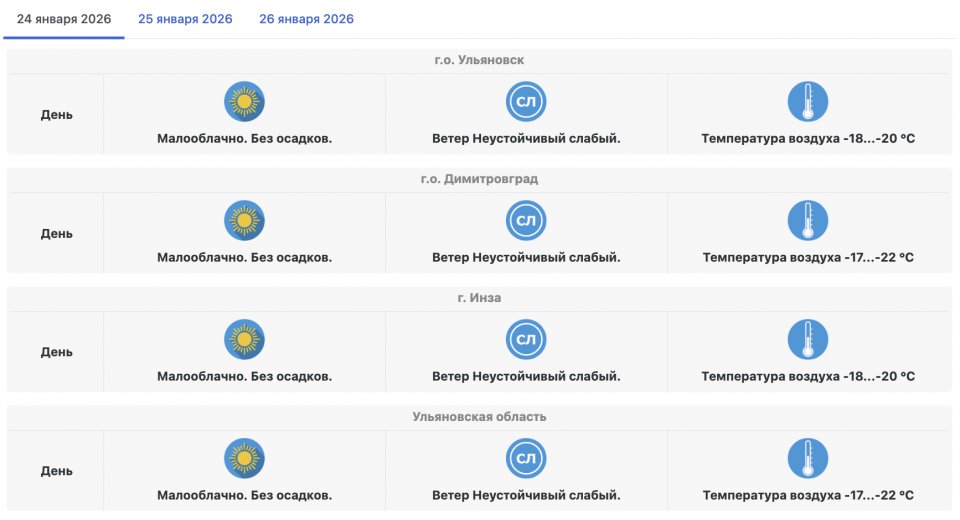 Днем в Ульяновске ожидается от –18 до –20 градусов. В Димитровграде температура воздуха составит –17…–22 градуса, в Инзе — около –18…–20 градусов. По области в целом днем прогнозируют –17…–22 градуса. Осадков не ожидается, небо будет малооблачным.