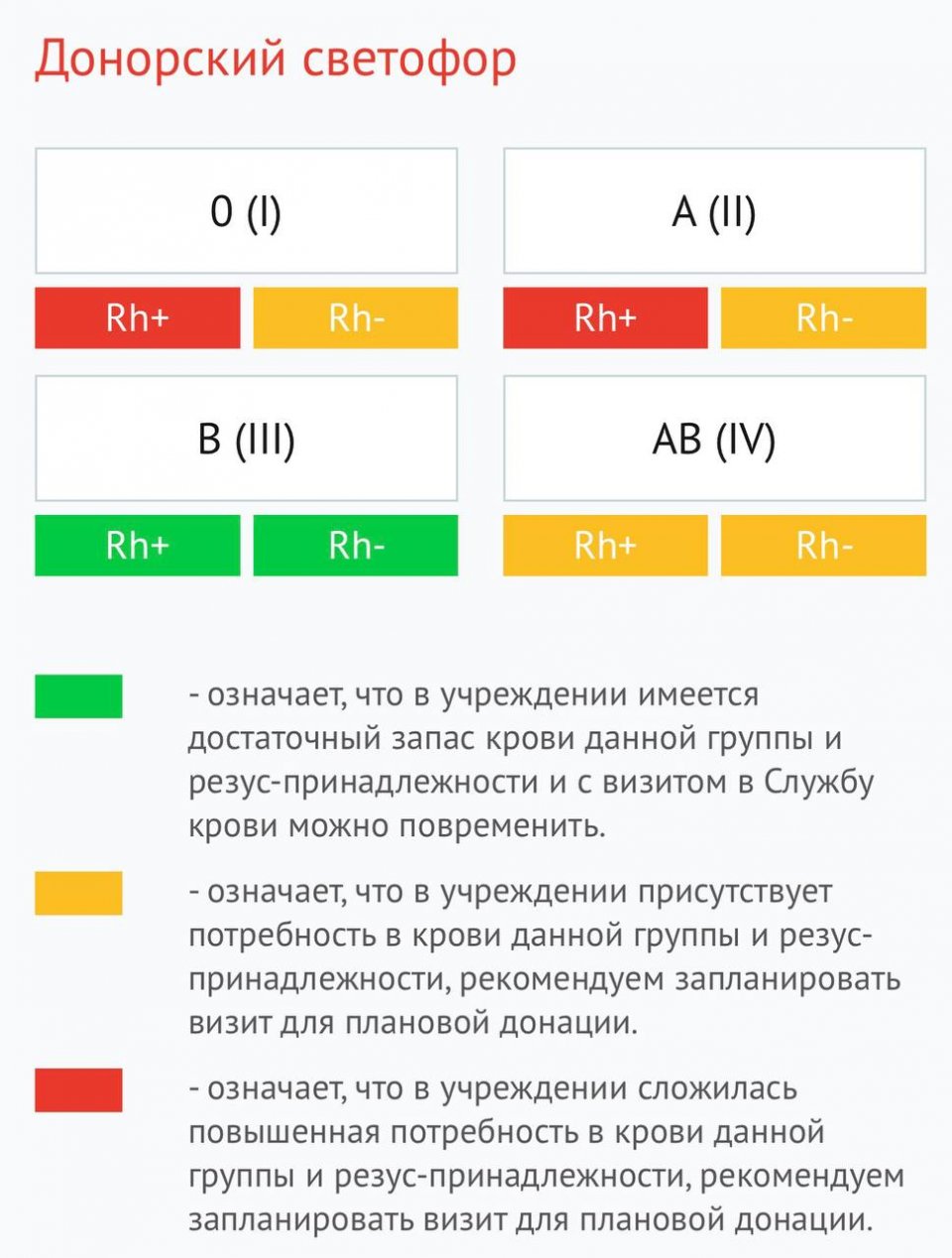 Напомним, система работает по принципу цветовых сигналов. Если группа отмечена зеленым цветом, значит запас крови сейчас сформирован, и визит можно отложить. Желтый сигнал говорит о необходимости плановой донации — кровь этой группы востребована. Красный цвет означает повышенную потребность: такие доноры особенно нужны медицинским учреждениям.