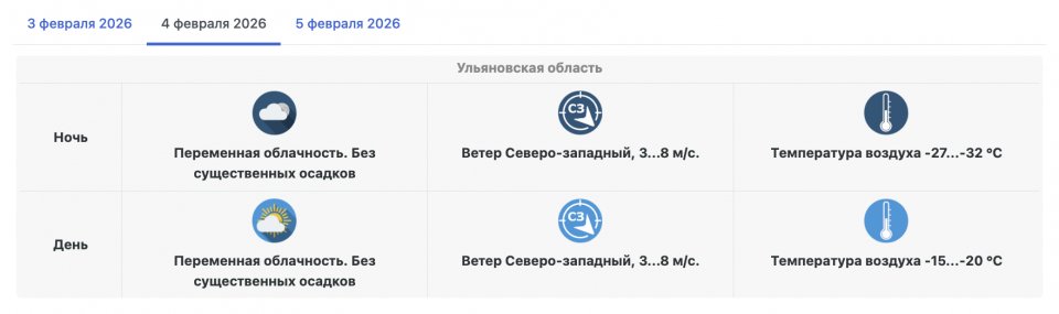 Во вторник, 3 февраля, днем по области сохранится переменная облачность. В отдельных районах возможен небольшой снег, преимущественно на юге и востоке региона. Температура воздуха составит от −14 до −19 градусов. В Ульяновске и Димитровграде возможен снег.