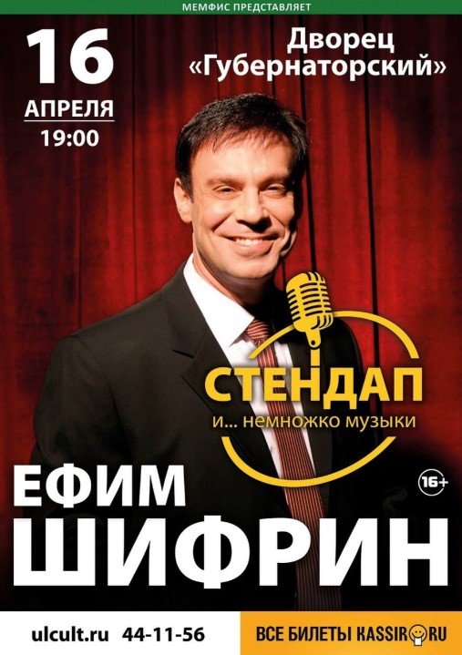 Сегодня, 16 апреля 2026 года, в 19:00, на сцене Дворца «Губернаторский» — Ефим Шифрин (16+)!